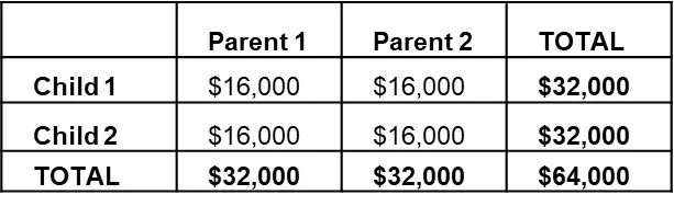 Currently, 529 account owners can contribute $16,000 per year per beneficiary (or a “bundled” contribution of up to $80,000 every five years) without triggering the gift tax. In a two-parent, two-child household where each parent opens 529 accounts for each child, the maximum annual contribution matrix looks like this: